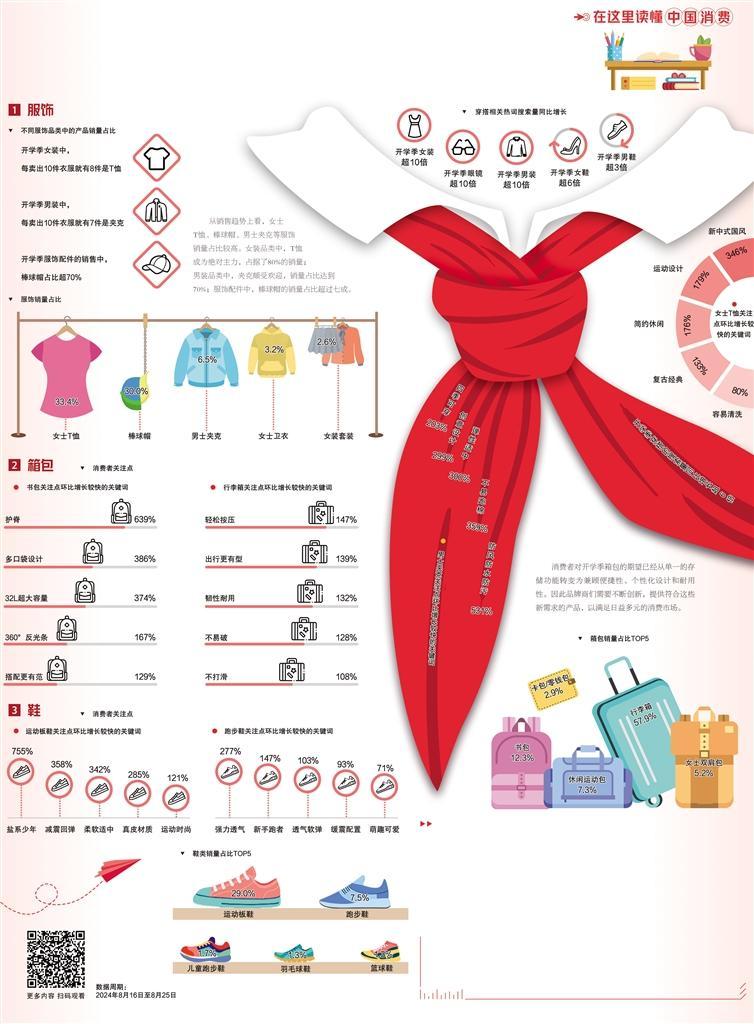 开学在即,为开学积极筹备、采购相关用品成为家长与学生群体近期关注的重点。数据显示,今年开学季穿搭相关商品的搜索量快速增长。其中,服饰的关注度尤为突出,搜索量增长较去年同期超10倍。