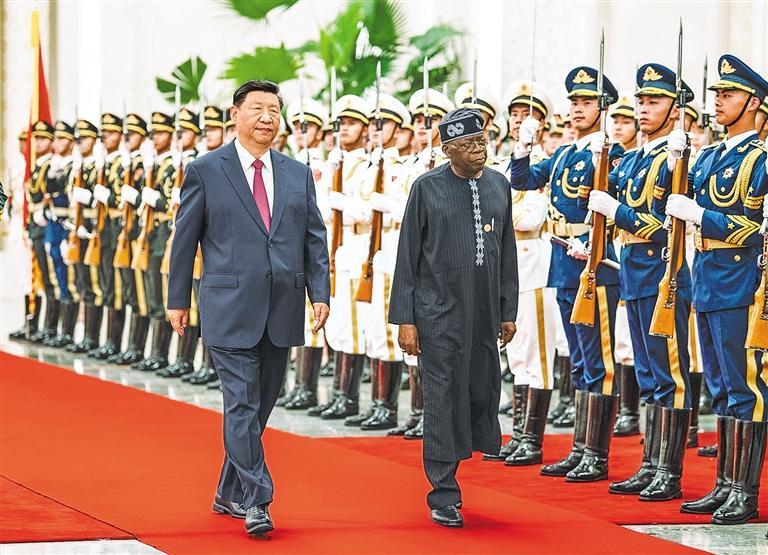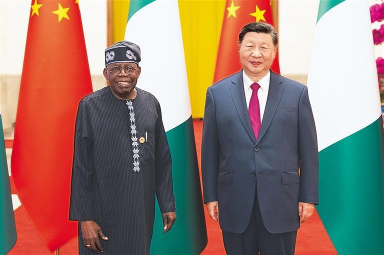 习近平指出,尼日利亚是具有重要影响的非洲大国,拥有巨大人口规模和发展潜力。建交半个多世纪以来,中尼始终相互尊重、平等相待,走出一条联合自强、合作共赢之路。近年来,两国在中非合作论坛框架内共同实施了一大批示范性、战略性合作项目。中国正在进一步全面深化改革、推进中国式现代化,这将为中尼关系发展带来更多机遇。双方要以高质量合作携手实现各自现代化,推动中尼关系实现新的更大发展。