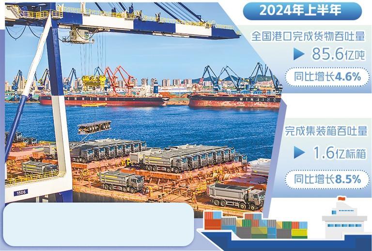 据了解,从2010年开始,我国制造业总体规模连续14年位居全球第一,带动大量货物进出口和港口运输发展。交通运输部数据显示,2024年上半年,全国港口完成货物吞吐量85.6亿吨,同比增长4.6%;完成集装箱吞吐量1.6亿标箱,同比增长8.5%。海运增长的同时,港口建设持续进行,上半年我国新增7座大型自动化码头,已建和在建的自动化码头数量位居世界首位。集装箱班轮航线覆盖100多个国家和地区,全球海运连接度稳居世界第一。