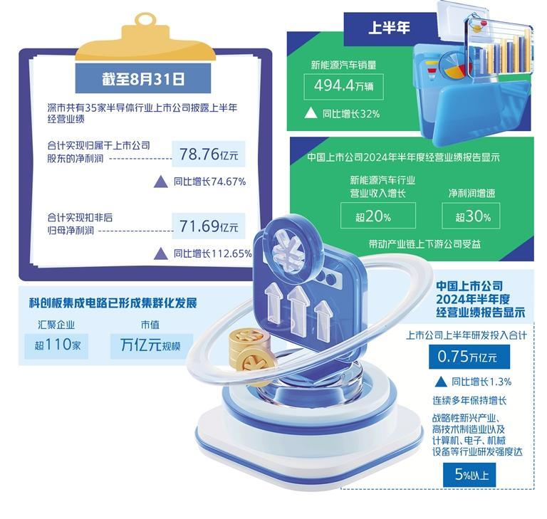 A股上市公司半年报披露收官。今年上半年,上市公司整体业绩持续修复,半导体、新能源、高端制造业等战略性新兴产业活力涌动,产业集群效应凸显,企业向新提质,有效助力经济平稳运行。