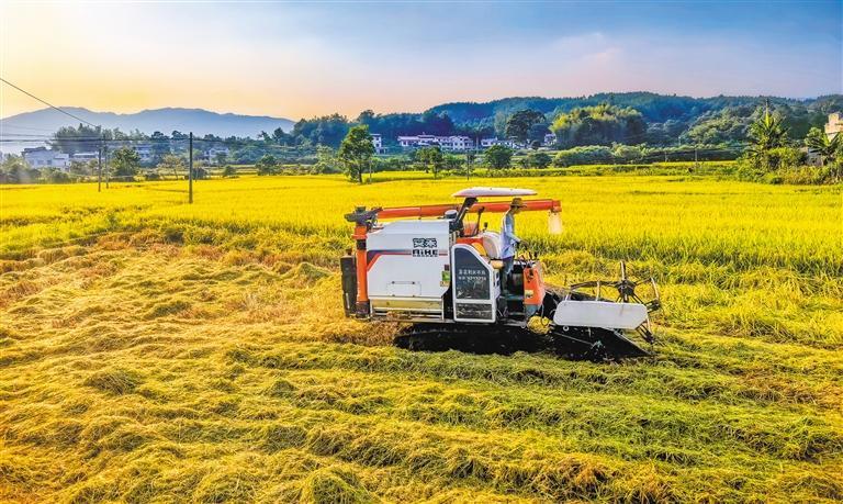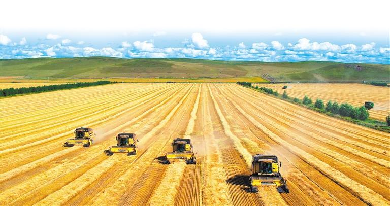 ⑥8月30日,内蒙古自治区呼伦贝尔农垦三河农牧场有限公司高标准农田建设示范田,农机手驾驶联合收割机在田间作业。