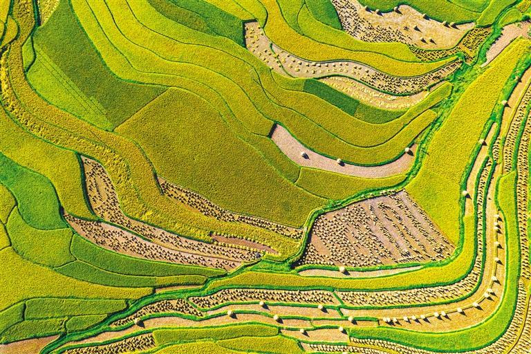 ⑤9月4日,贵州省黔西市锦星镇洪湖村,村民在收割稻谷。