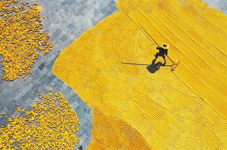 ③8月27日,重庆市黔江区鹅池镇方家村,村民在晾晒稻谷和玉米。