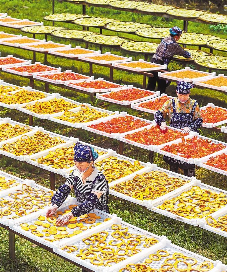 ①8月26日,江西省宜春市铜鼓县温泉镇禄田村,村民在晾晒南瓜、辣椒、苦瓜等农作物。