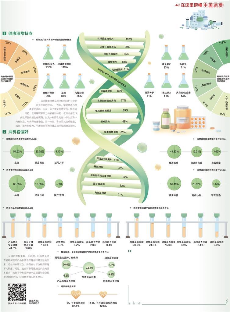 随着“购药渠道多元化、检测方法便捷化”,越来越多消费者关注线上购药,并主动为家庭备药。调研显示,超八成的受访者认为“家中有备药,会更加放心”。从购药种类上来看,抗细菌感染用药、高血压用药、安神补脑类用药、流行性感冒药、破壁饮片等更受关注。从关联购买特点来看,线上购药人群对食品及生活日用品的消费频次较高,并对品牌品质更加关注。