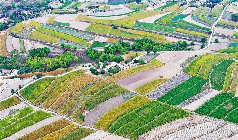 9月8日,甘肃省定西市安定区香泉镇的黄土高原梯田。初秋时节,当地梯田里的农作物青黄相接、纵横交错,宛若大地的脉络。