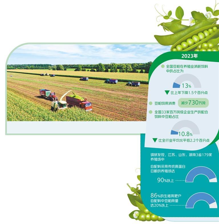 经过努力,相关工作初见成效。2023年,全国豆粕在养殖业消耗饲料中的占比为13%,比上年下降1.5个百分点,按全年饲料消耗量测算,豆粕饲用消费减少730万吨,相当于减少大豆饲用需求900多万吨。全国33家百万吨级企业生产的配合饲料中豆粕占比为10.8%,比全行业平均水平低2.2个百分点,示范带动效果显著。乙醇梭菌蛋白制备关键核心技术取得突破,适用范围由鱼类扩大至猪鸡,产能达到2.5万吨。餐桌剩余食物饲料化利用试点稳妥有序推进,探索形成了较为完善的市场化运行模式和有效监管机制。优质饲草供给也在持续增加,牛羊养殖“以草代料”稳步推进。2023年,完成粮改饲面积2325万亩,收储优质饲草约6850万吨,带动减少牛羊精饲料消耗近1300万吨。