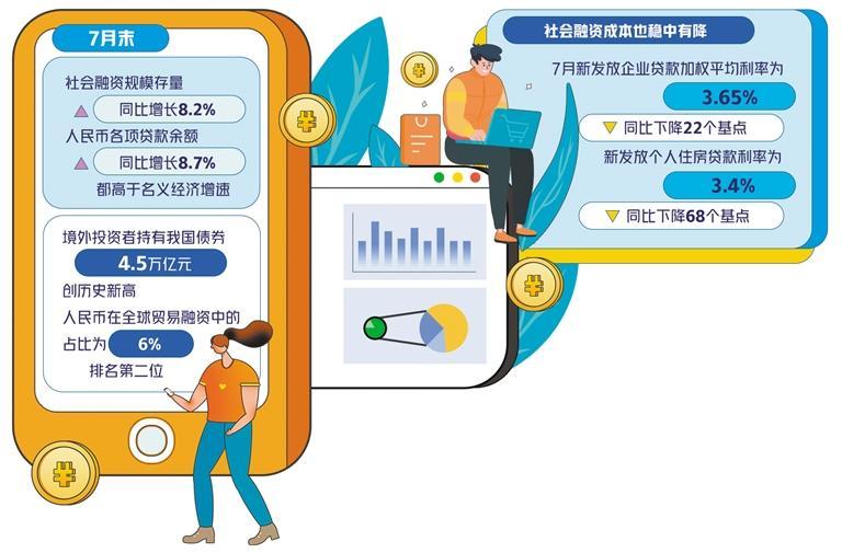 一系列政策取得了良好的效果。7月末,社会融资规模存量同比增长8.2%,人民币各项贷款余额同比增长8.7%,都高于名义经济增速。社会融资成本也稳中有降,7月新发放企业贷款加权平均利率为3.65%,新发放个人住房贷款利率为3.4%,同比分别下降了22个和68个基点。7月末,境外投资者持有我国债券4.5万亿元,创历史新高。人民币在全球贸易融资中的占比为6%,排名第二位。