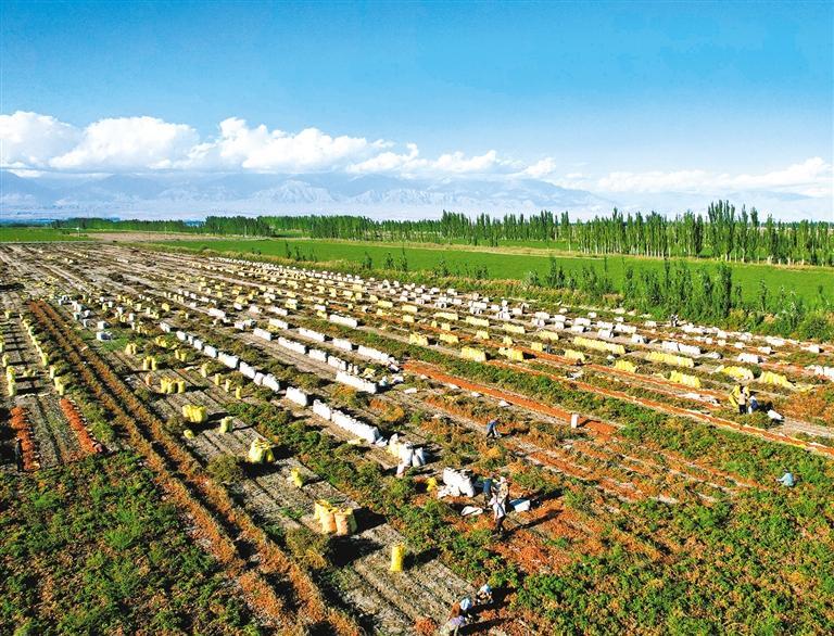 9月8日,新疆生产建设兵团第二师铁门关市二十二团河畔镇二连的一块农田里,工人正在采摘酱用番茄。眼下,当地种植的8.02万亩酱用番茄进入关键收获期,各团场连队职工采用机械和人工同时作业的方式,进行番茄采收。谢江林摄(中经视觉)