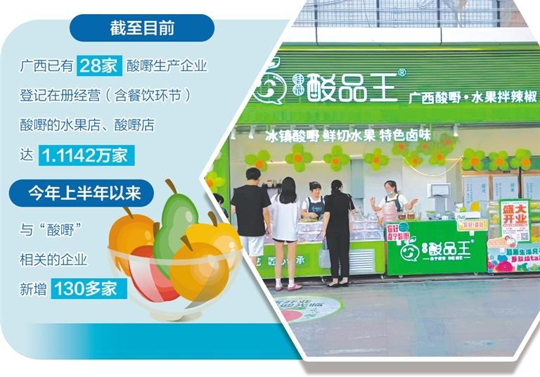 截至目前,广西已有28家酸嘢生产企业,登记在册经营(含餐饮环节)酸嘢的水果店、酸嘢店多达1.1142万家。相关数据显示,今年上半年以来,与“酸嘢”相关的企业新增130多家。广西正深化各方联动协作,力争用1年左右时间推动在北京开设100家以上的广西酸嘢店铺,培育一批广西酸嘢领跑企业,延伸广西酸嘢产业链条。