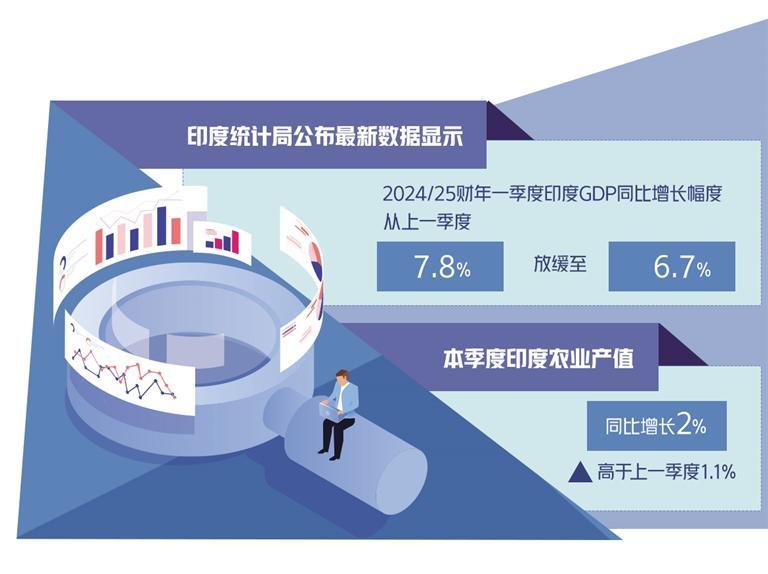 印度统计局近日公布最新数据显示,2024/25财年一季度(2024年4月至2024年6月),印度的国内生产总值(GDP)同比增长幅度从上一季度的7.8%放缓至6.7%,低于路透社民意调查预测的6.9%的增长率。印度统计局表示,增速放缓主要是政府公共支出显著下降所致。同时,数据显示二季度印度制造业明显减速,影响了印度经济增长。