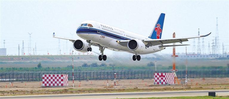 9月12日,中国南方航空首架C919国产大飞机(编号为B—919J)在东营机场开展飞行训练任务。东营试飞基地主要承担C919大型客机、ARJ21支线客机科研试飞、地面实验和飞行人才培养等任务。周广学摄(中经视觉)