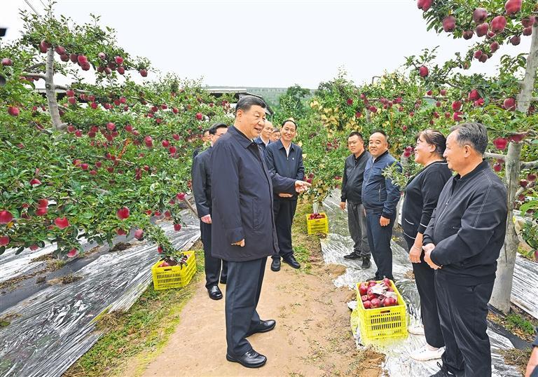 红彤彤的花牛苹果挂满枝头,一派丰收景象。习近平走进果林,了解相关种植、技术和管理情况。他说,乡村振兴关键在产业振兴。经过70多年培育发展,花牛苹果品牌更响亮了。要加强品种保护和培育,优化种植方式,创新营销模式,把这个特色产业做得更大,带动更多群众增收致富。他祝乡亲们的生活像苹果一样红红火火。