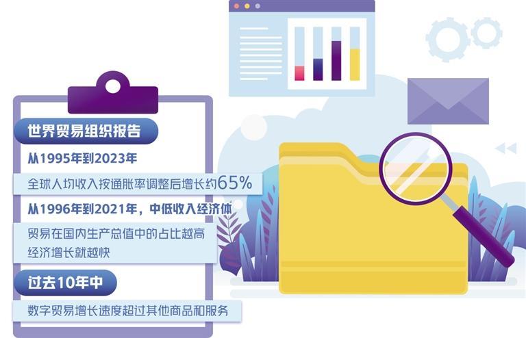 贸易促进了全球经济增长,有助于缩小经济体之间的收入差距。报告指出,世贸组织成立以来,贸易在缩小各经济体之间的收入差距方面发挥了至关重要的作用,世界经历了一个前所未有的收入增长和包容性发展时期:从1995年到2023年,全球人均收入按通胀率调整后增长了约65%。其中,低收入和中低收入经济体的人均收入几乎翻了一番。从1996年到2021年,对于中低收入经济体而言,贸易在国内生产总值中的占比越高,其经济增长就越快,并进一步帮助这些经济体缩小与高收入经济体的人均收入差距。