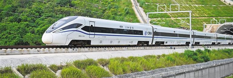 9月13日,和谐号试验列车驶出龙龙高铁梅龙段毛公寨隧道。
