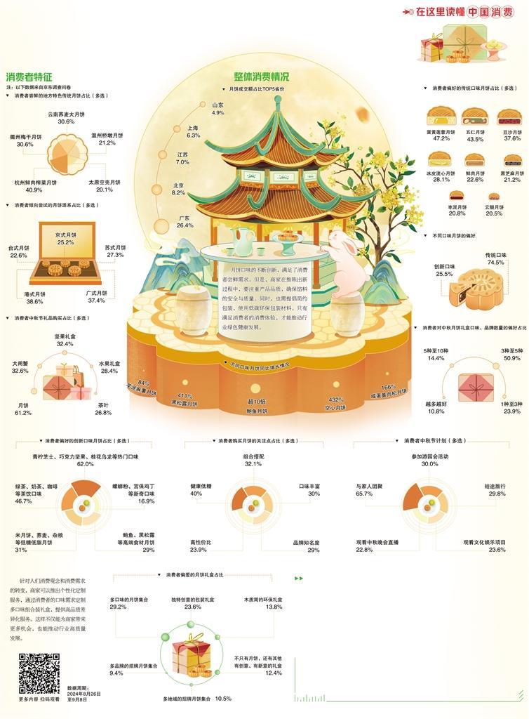 今年中秋节,“多口味组合装月饼”迎来消费热潮。数据显示,超三成消费者强烈呼吁“希望找到组合装月饼,能一次性尝到不同品牌不同口味的月饼”,超七成消费者希望中秋礼盒中包括3种以上不同口味、品牌的月饼。此外,也有四成消费者关注健康的低糖月饼。这反映出消费者对月饼的消费需求只增不减,也预示着未来月饼行业发展仍有较大潜力,商家需抓住节日热点,迎合消费者需求,加强不同口味月饼的供应,严格把控产品质量。