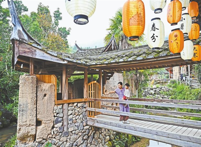 龙潭村位于福建省宁德市屏南县熙岭乡的崇山峻岭间,入选第六批中国传统村落。在屏南县传统村落文创产业项目带动下,龙潭村被改造成为远近闻名的“网红村”,每年吸引80多万人次前来旅游打卡。图为一位游客带着孩子在龙潭村游玩。 新华社记者 姜克红摄
