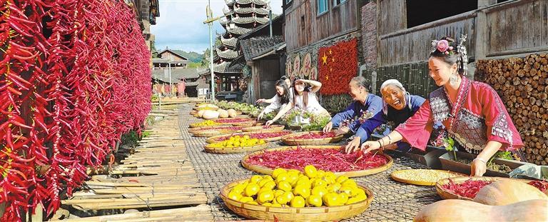9月16日,湖南省怀化市通道侗族自治县双江镇芋头村古侗寨,游客与当地村民翻晒农作物。金秋时节,该村推出的“晒秋”创意作品与古侗寨构成美丽风景,吸引游客纷至沓来。