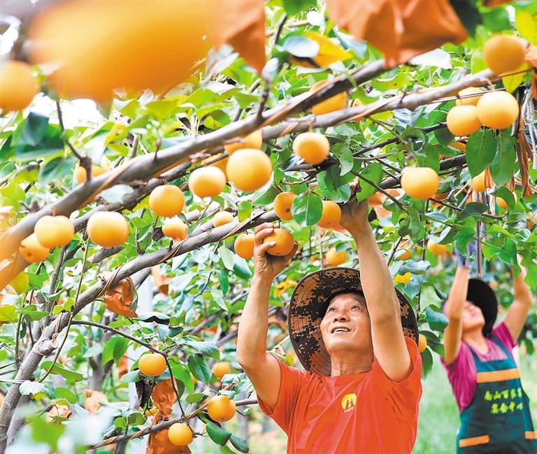 ▼9月11日,安徽省淮北市杜集区矿山集街道南山村,工人在采摘黄金蜜梨。近年来,当地统筹推进特色水果产业种植,不断提升农产品附加值。