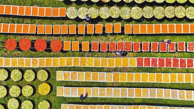 ▲8月26日,江西省宜春市铜鼓县温泉镇禄田村,村民在晾晒农作物。南瓜、薯干、辣椒、苦瓜、笋干等农作物铺满房前屋后,绘就一幅五彩缤纷的丰收图景。