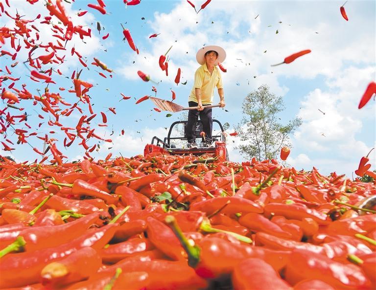 ▼9月13日,四川省达州市达川区堡子镇长垭村红乡种植专业合作社富硒生态蔬菜种植基地,村民在晾晒有机红辣椒。达州市采取“公司+合作社+党支部+农户”的模式,为辣椒拓宽销路。