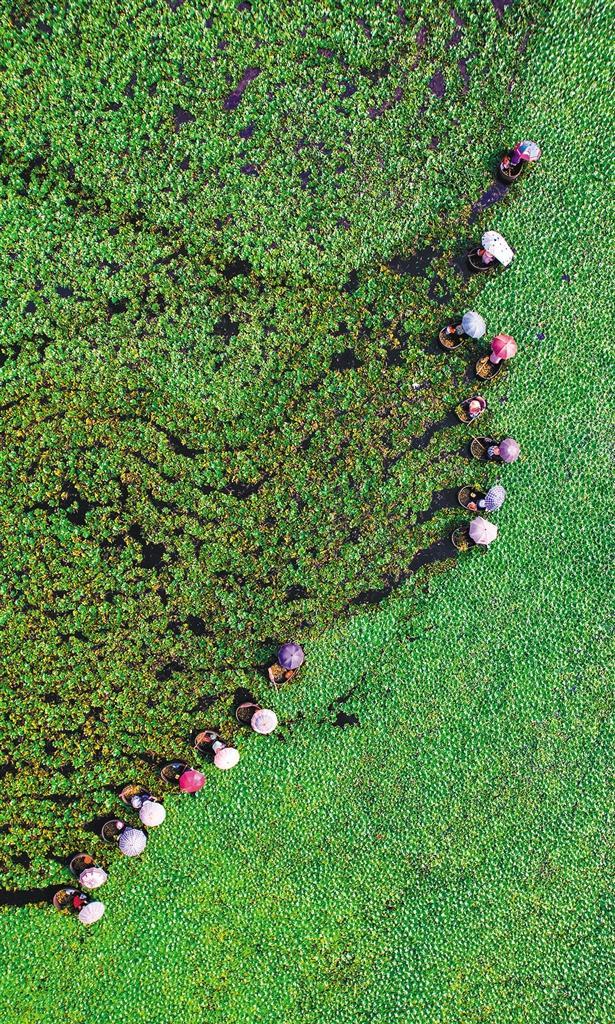 ▲9月14日,湖北省浠水县散花镇天井湖村菱角种植基地,农户采摘头茬菱角。近年来,浠水县大力发展水生经济作物,帮助农民拓宽增收渠道。
