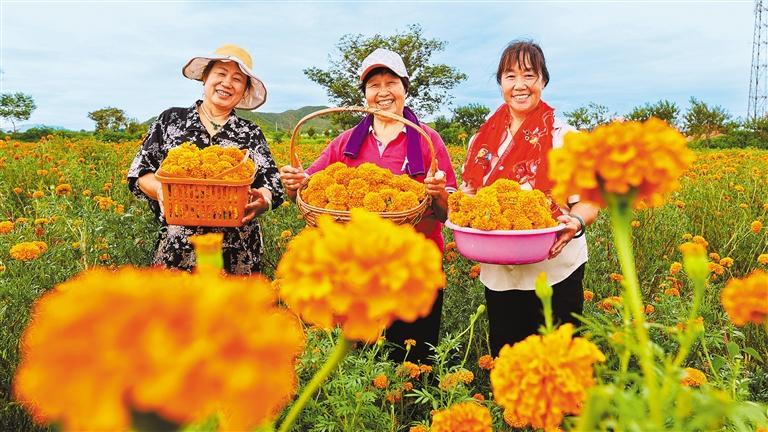 ▶9月5日,河北省邯郸市复兴区东高河村万寿菊种植基地,农民展示采摘的万寿菊。当地引导农民发展万寿菊、金丝皇菊种植,有效拉动村集体经济发展。