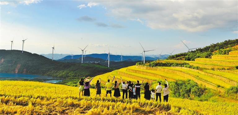 ▼9月16日,游客在广西贺州市富川瑶族自治县白沙镇白沙社区可达梯田游览。连绵起伏的丰收稻田,与湖水、远山、风车构成一幅美丽的金秋画卷。黄旭胡摄(中经视觉)