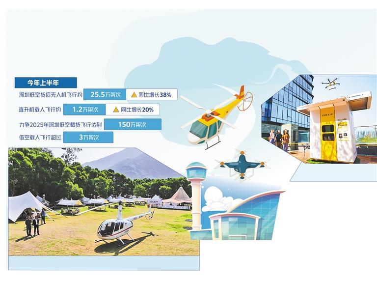 当前,深圳低空应用场景已覆盖空中通勤、低空观光、物流配送、城市治理、应急救援等各个领域,仅在物流配送方面,便涉及快递配送、餐饮配送、医疗运输、生鲜冷链等。今年上半年,深圳低空载货无人机飞行量、新增货运航线、载人飞行量、运送人数规模均居全国前列。其中,低空货运无人机飞行约25.5万架次,同比增长38%;直升机载人飞行约1.2万架次,同比增长20%。目前,深圳正进一步拓展应用服务,力争2025年低空载货飞行达到150万架次,低空载人飞行超过3万架次。