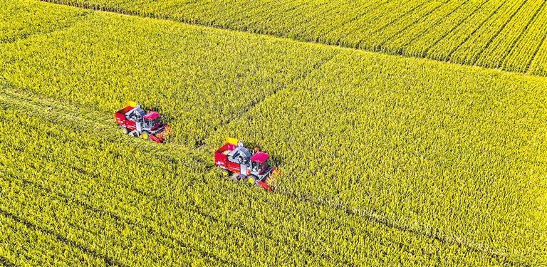 九月十八日,大型玉米联合收割机在甘肃省张掖市甘州区三闸镇万亩玉米制种核心示范基地里收获成熟的制种玉米。王 将摄(中经视觉)
