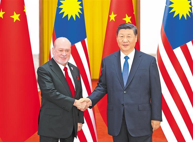 习近平指出,中国同马来西亚隔海相望,两国友谊传承千年。1974年建交以来,中马始终友好相处、守望相助,树立了国与国相互成就、合作共赢的典范。今年是中马建交50周年暨“中马友好年”,是中马关系承前启后、继往开来的重要年份。中国正在进一步全面深化改革、推进高水平对外开放,这将给中马两国合作带来新动力、新机遇。中方愿同马方传承发扬优良传统,做世代友好的亲密邻居、携手发展的真诚伙伴、情同手足的知心朋友、共促和平的重要力量,在各自现代化发展征程中深化战略合作,推动中马命运共同体建设不断迈上新台阶。