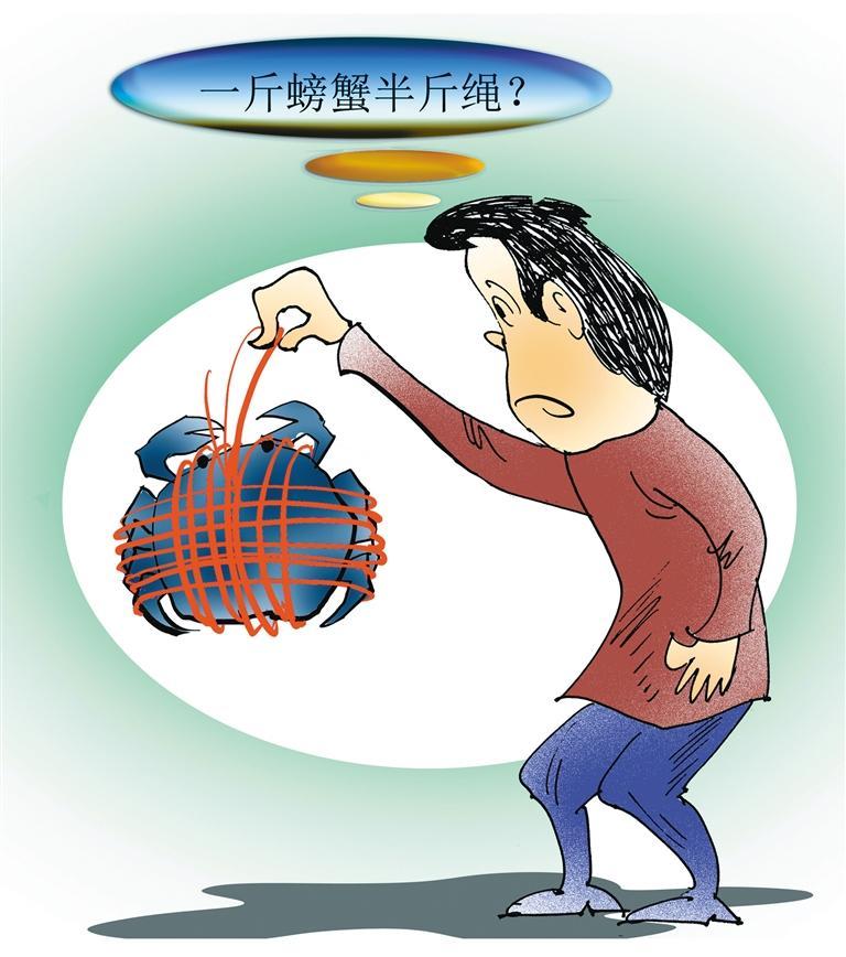 秋风起,闻蟹来。眼下正是螃蟹肉满膏肥之时,然而一些消费者在购买螃蟹时,发现其身上捆绑着重重绳索,有的甚至“一斤螃蟹半斤绳”。螃蟹绑绳售卖由来已久,扎绳方便运输、销售。然而,部分商户用过粗或者吸水性强的绳子捆扎螃蟹,且并未明确告知价格为“含绳价”等,影响了消费者合法权益。足斤足两、明白消费,是消费者公平交易的权利。维护诚信经营的市场秩序,解答好“一斤螃蟹半斤绳”这道不算新的题目,有必要进一步厘清标准,强化监管。目前,已有网络销售平台提出“足斤足两”概念,消费者收到产品后,如果去绳称重,损耗高于行业标准以上,平台将会赔付。今后,还应严格查处缺斤短两等行为,打击不良商家,让消费者放心选购。(时 锋)