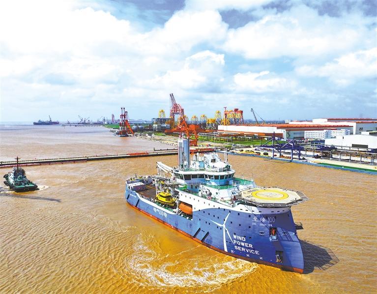 9月19日,上海振华重工为上海电气风电建造的亚洲首制风电运维母船“至臻100”“至诚60”在江苏启东启航投运,将服务江苏、广东两处风电场。两艘风电运维母船均可在深远海风场进行连续运维作业的专用高效船舶,集高效运维、绿色运维、智能运维、安全运维于一体,自持力均达30天以上。许丛军摄(中经视觉)