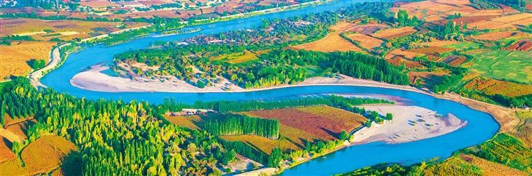 9月22日,甘肃省张掖市甘州区乌江镇黑河流域,碧水蜿蜒,田园金黄,呈现美丽的金秋“丰”景画。