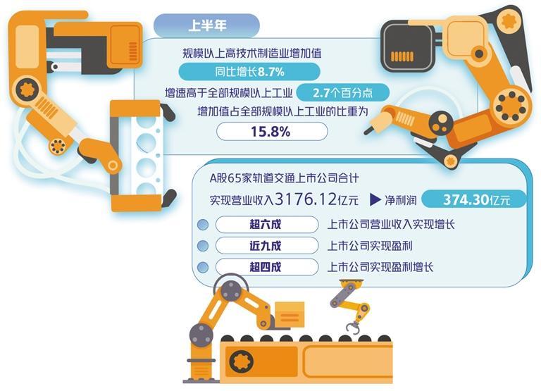 得益于国家战略部署和经济复苏后旺盛的出行需求,国内轨道交通市场逐步迈入景气度提升的新周期。数据显示,上半年,A股65家轨道交通上市公司合计实现营业收入3176.12亿元,净利润374.30亿元;超六成上市公司营业收入实现增长,近九成上市公司实现盈利,超四成上市公司实现盈利增长。