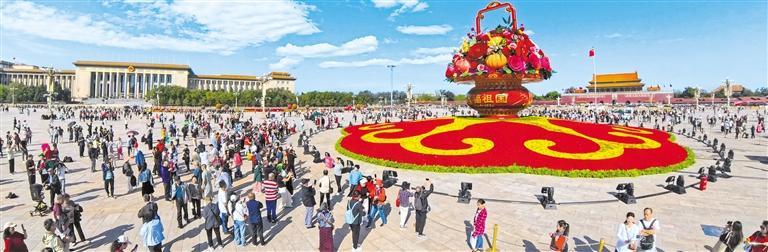 9月25日,游客在天安门广场观赏当日亮相的“祝福祖国”巨型花篮。巨型花篮顶高18米,以喜庆的蔬果花篮为主景,篮内除传统的牡丹花、月季花等花卉外,首次选取了分别寓意福禄吉祥、喜庆丰收、红红火火的葫芦、南瓜、辣椒等蔬果,体现“蔬果飘香、繁花似锦”。