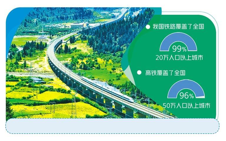 目前,铁路覆盖了全国99%的20万人口以上城市,高铁覆盖了全国96%的50万人口以上城市,路网密度和人均铁路拥有量大幅提升。中国高铁营业里程居世界第一位,超过世界上其他国家高铁营业里程的总和,中国也是世界上唯一实现高铁时速350公里商业运营的国家。