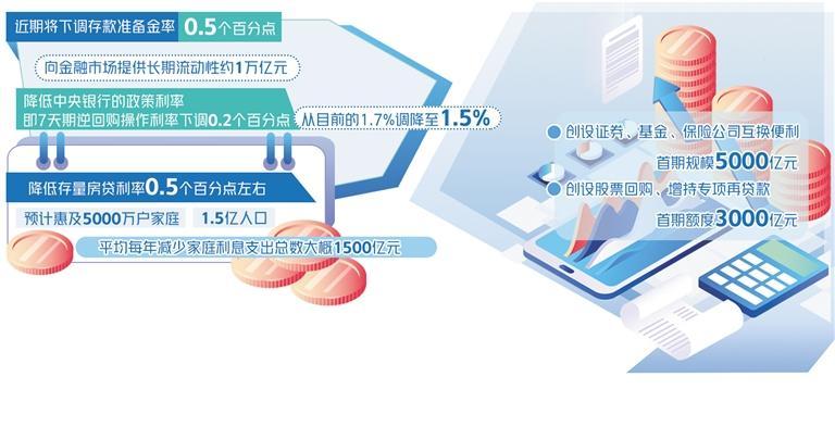 今年以来,央行在2月、5月、7月先后3次实施了比较重大的货币政策调整。近日,央行宣布将发布几项新政策:第一,降低存款准备金率和政策利率,并带动市场基准利率下行。第二,降低存量房贷利率,并统一房贷最低首付比例。第三,首次设立支持资本市场的结构性货币政策工具,支持股票市场稳定发展。