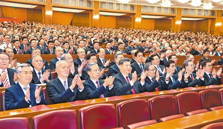 人民大会堂万人大礼堂华灯璀璨、气氛喜庆。19时55分,在欢快的乐曲声中,习近平等领导同志步入大礼堂,同少数民族代表、老同志代表亲切握手,全场响起热烈的掌声。