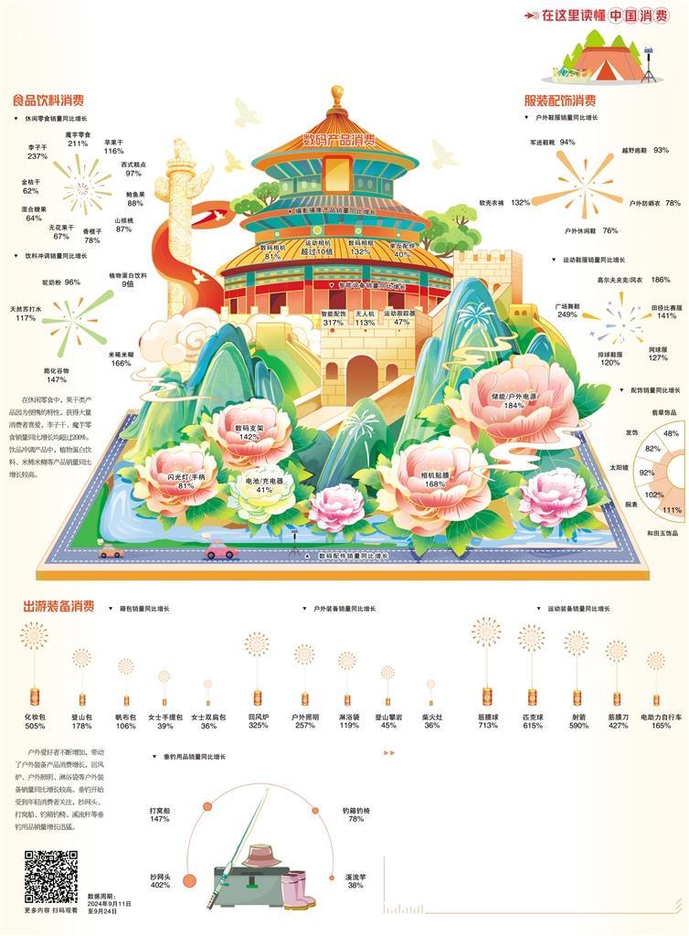 今年以来,旅游消费持续升温。文化和旅游部数据显示,上半年国内出游人次27.25亿,同比增长14.3%,国内游客出游总花费2.73万亿元,同比增长19%。下半年,国内旅游热度延续,出游消费热情高涨,带动食品饮料、户外穿搭、户外装备、数码装备等相关产品的销售增长明显。