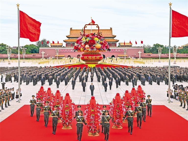 壮阔的天安门广场上,鲜艳的五星红旗迎风招展。广场中央,“祝福祖国”巨型花篮表达着对祖国繁荣昌盛的美好祝福。巍然耸立的人民英雄纪念碑北侧,两组花坛上镶嵌着白菊等鲜花组成的18个花环,寄托着全体中华儿女对英烈的深切缅怀。