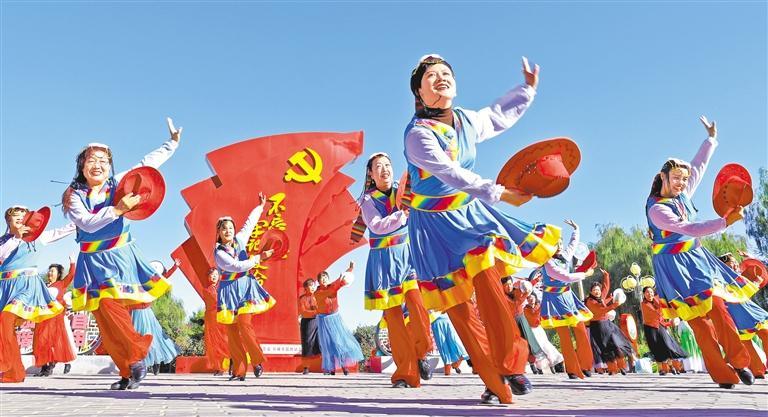 10月1日上午,甘肃省张掖市甘州区润泉湖公园广场,张掖水兵舞艺术团表演舞蹈节目,庆祝中华人民共和国迎来75周年华诞。王 将摄(中经视觉)