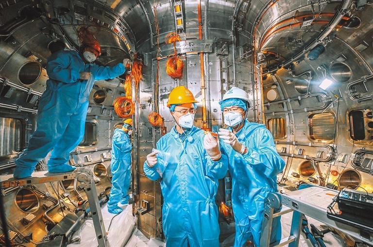 ④2022年4月26日,中核集团科技人员在新一代人造太阳真空室内工作。2022年10月,新一代“人造太阳”等离子体电流突破100万安培(1兆安),创造了中国可控核聚变装置运行新纪录。王雨萌摄(中经视觉)