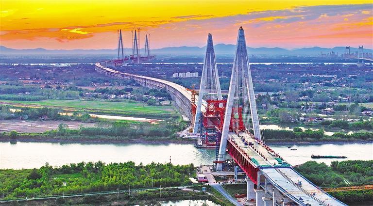 10月2日傍晚,安徽省马鞍山市当涂县巢马城际铁路马鞍山长江公铁大桥建设现场,工人们坚守岗位,有序推进项目建设。巢马城际铁路是安徽通往上海等城市的新通道,建成后将有力促进长三角一体化发展。
