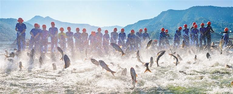 ⑤7月5日,浙江省杭州市淳安县千岛湖启动鲢鳙鱼捕捞季,一网收获了6万斤鲢鳙鱼。