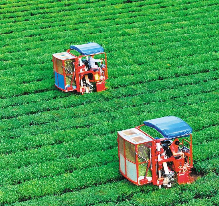 ③8月24日,江西省吉安市泰和县泰和垦殖场茶叶种植基地,工人驾驶采茶机采收秋茶。
