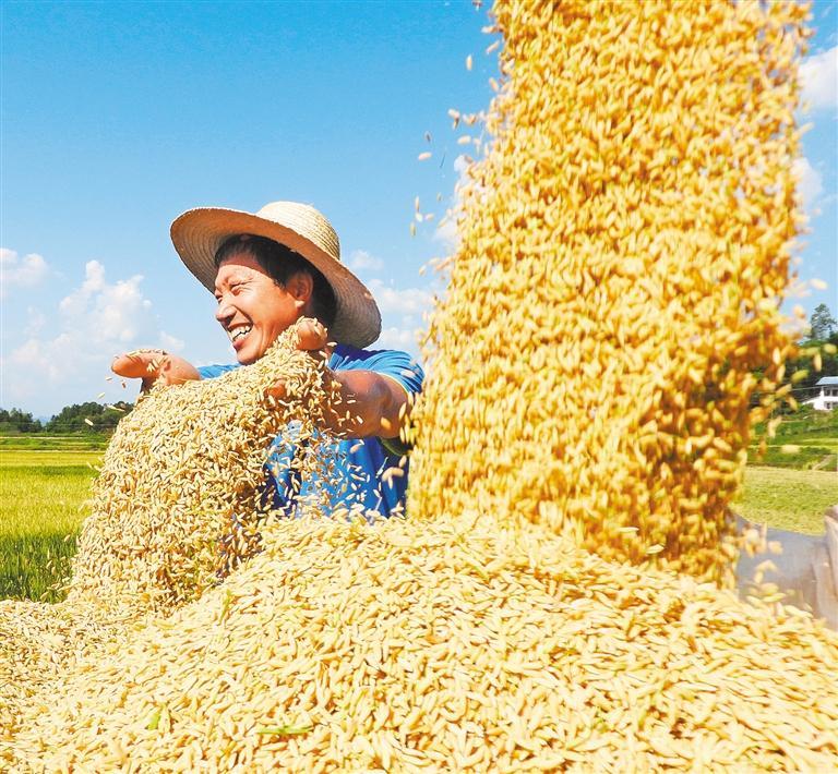 ①8月14日,“川东粮仓”四川省达州市东部经开区麻柳镇圣龙庙村,村民喜迎水稻丰收。