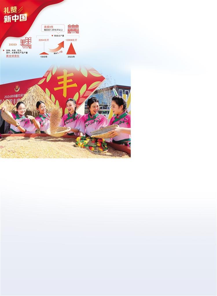 丰收的田野是最美的画卷。从“5亿人吃不饱”到“14亿多人吃得好”,新中国成立75年来,我国农业发展呈现翻天覆地的变化,实现了举世瞩目的发展,中国人把饭碗牢牢端在了自己手中。我国粮食总产量由1949年的2264亿斤增加到2023年的13908亿斤,增长5.1倍;2023年人均粮食产量493公斤,不仅超出世界平均水平,也高于国际公认的400公斤粮食安全线。党的十八大以来,我国粮食连续9年稳定在1.3万亿斤以上。丰收的喜悦里,有泥土味儿,也有科技范儿;有供给充足,也有质优价稳;有结构调优,也有动能向绿。强国必先强农,农强方能国强。新征程上,我们正奋力谱写更加壮丽的“三农”新篇章。