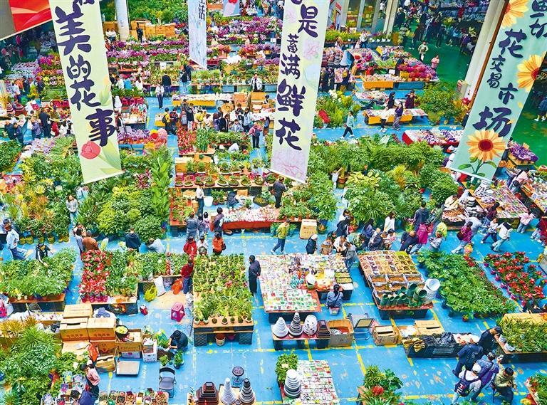 右图 10月3日,云南省昆明市呈贡区斗南花卉市场,前来游玩、选购鲜花的市民游客络绎不绝。