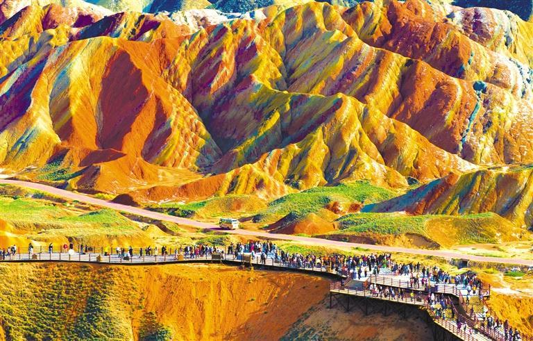上图 10月3日,游客在甘肃省张掖七彩丹霞景区游玩。